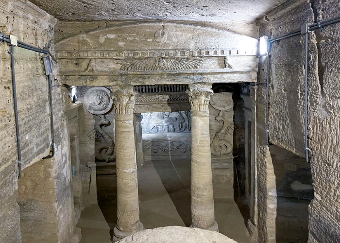The catacombs in Kom El Shoqafa were built in the Roman era. They have three levels and their decoration shows a juxtaposition of the Egyptian and Roman panthea.
